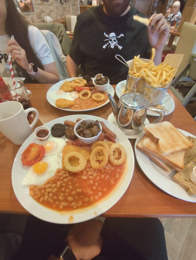 Já no primeiro dia, paramos para comer um Irish Breakfast e fazer um pequeno turismo. Acho muito legal porque eles fazem realmente eu me sentir confortável e me trazer experiências, mesmo que eles estejam cansados.