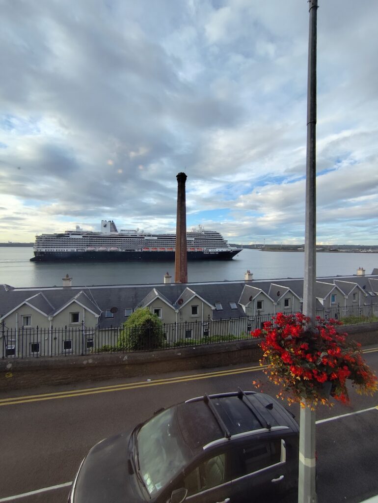 Eles moram em um local lindo que dá visão para o mar é relaxante simplesmente acordar e ver a paisagem. Inclusive no dia que eu cheguei lá, o cruzeiro estava chegando em Cobh. Cobh é famosa por ser a última cidade que o Titanic parou antes de naufragar. É uma cidade minúscula mas que tem seu jeitinho especial de ser.