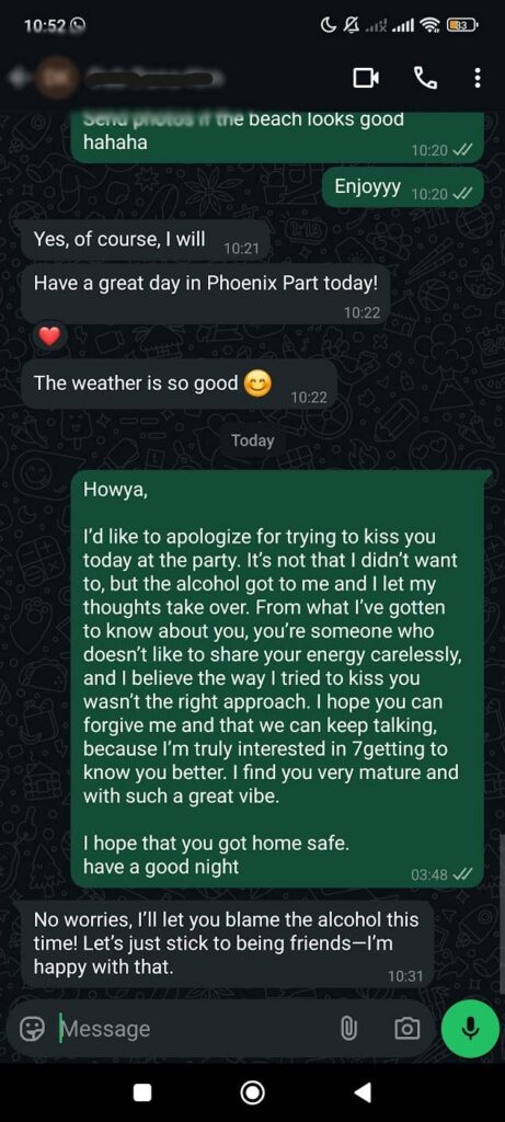 Nessa mesma noite, eu comecei a conversar com uma coreana e ela foi muito simpática comigo, resultado: Quando eu estava indo para o banheiro, encontrei ela e tentei beijar ela e ela não queria e a amiga puxou ela para resgatar ela de mim. Eu também não me importei com essa situação no momento até porque, ela continuou lá, dançando e curtindo. O problema foi no dia seguinte…